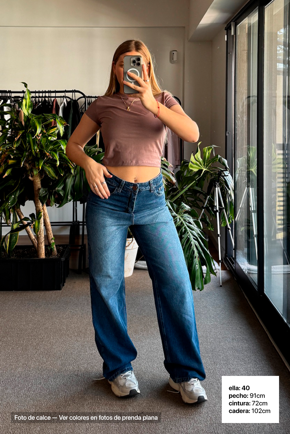 Descripción y Calce: Jean rígido de mujer, tiro medio y corte extra wide leg. Calce...